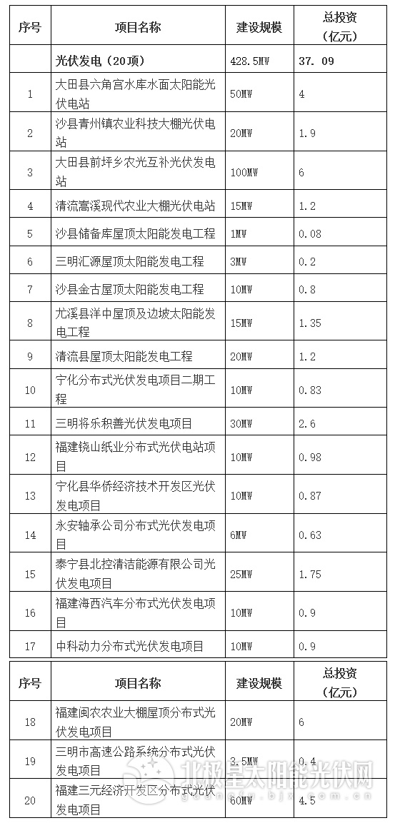 中國儲能網(wǎng)訊:近日,三明市人民政府辦公室關(guān)于印發(fā)三明市“十三五”能源發(fā)展專項(xiàng)規(guī)劃的通知,規(guī)劃羅列了能源建設(shè)的重點(diǎn)項(xiàng)目共72項(xiàng),包括核電、光伏發(fā)電、風(fēng)力發(fā)電、水力發(fā)電、火力發(fā)電、變電站、天然氣、煤礦及電動(dòng)汽車充換電基礎(chǔ)設(shè)施等項(xiàng)目。其中指出,“十三五”期間規(guī)劃光伏發(fā)電項(xiàng)目20個(gè),共428.5MW,計(jì)劃總投資37.09億元。