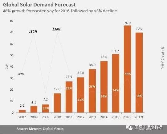 然而,Mercom Capital對2017年光伏新增裝機(jī)的規(guī)模不甚樂觀,與2016年相比可能下降8%(新增70GW),主要是因?yàn)槭艿焦夥鼧?biāo)桿價(jià)下調(diào)的影響,2017年中國的光伏新增裝機(jī)預(yù)計(jì)僅有17GW。