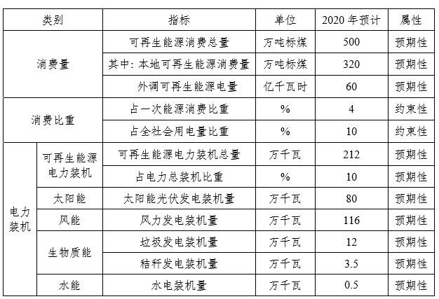 著力擴大可再生能源電力裝機規(guī)模,提高消費比重,增強消納能力,提升產(chǎn)業(yè)技術(shù)水平。到2020年,可再生能源利用量達到500萬噸標(biāo)煤,占一次能源消費比重超過4%;可再生能源發(fā)電裝機達到212萬千瓦,占全市電力總裝機的10%;非水可再生能源消納電量(含外購可再生能源電量)占全社會用電量的比重達到10%。