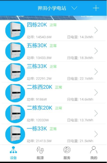 在手機APP上可以查看每一個電站每一天的發(fā)電曲線,每一天的發(fā)電量,每個月的發(fā)電量,也可以查看當天每一臺機的運行參數(shù),如PV功率,電壓,電流,輸出每一相的功率,可以方便查找問題。