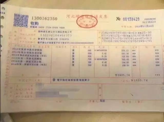 今夏,河北唐山市普通居民電站投資業(yè)主付先生提供了供電公司的購電發(fā)票。國網(wǎng)冀北唐山市豐潤區(qū)供電公司發(fā)給付先生的購電和補貼發(fā)票,明確顯示了電網(wǎng)公司的購電度數(shù)、單價和金額,還包括國家每度電0.42元補貼和河北省每度電補貼0.2元。