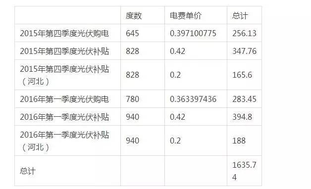 通過上面發(fā)票的數(shù)據(jù),我們可以看出,2015年第四季度和2016年第一季度的發(fā)電量,計算出來日平均發(fā)電量10kw/h。