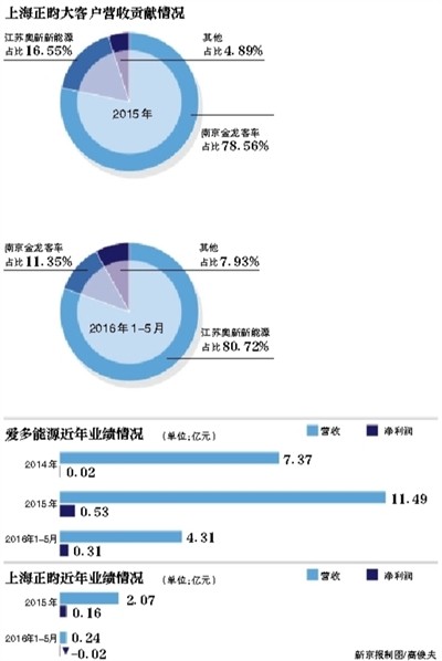 2016年1—5月,上海正昀第一大客戶的位置已由南京金龍變?yōu)榻K奧新新能源。數(shù)據(jù)顯示,上海正昀針對奧新新能源的銷售額為1914萬,營收占比卻高達(dá)80.72%,原來的第一大客戶南京金龍退居第二,對應(yīng)的銷售額僅為269萬元。