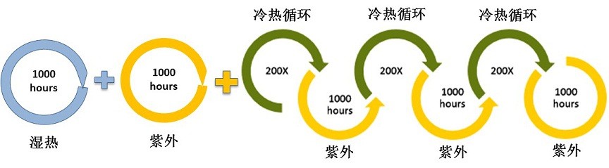為了更好的模擬戶外老化應(yīng)力對材料的影響,最好能采用更能反映戶外情況的序列老化測試,即在加速老化測試中將原來單項(xiàng)的紫外、濕熱和冷熱應(yīng)力等老化因素測試按照一定順序?qū)ν粋€(gè)樣品進(jìn)行測試,這樣就能更好評估不同材料在長期老化性能方面的差異。