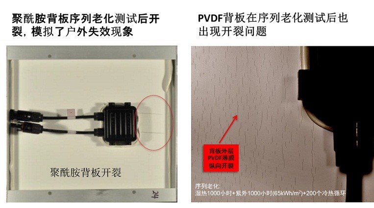 舉例來說,以序列老化測試對PVDF背板以及PVF背板進(jìn)行序列老化測試后,PVDF背板出現(xiàn)了開裂現(xiàn)象,這說明由于PVDF薄膜橫向力學(xué)性能不佳,在老化后容易變脆,在冷熱循環(huán)應(yīng)力下容易朝單一方向開裂;而PVF薄膜因?yàn)槭请p向拉伸的成膜技術(shù),所以不會有這種問題。