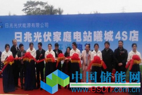 (圖片說明:各界來賓和日兆科技公司領(lǐng)導共同為全國首家家庭光伏4S店剪彩)