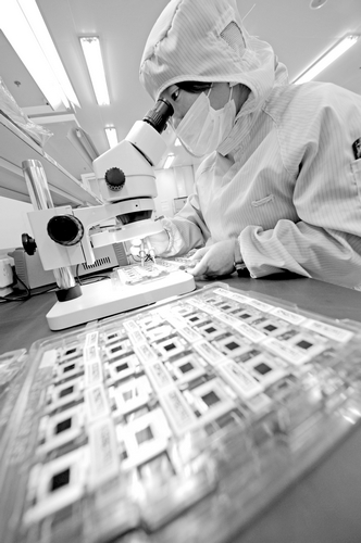 中國(guó)儲(chǔ)能網(wǎng)訊:2月8日,安徽淮南日芯光伏科技有限公司工人生產(chǎn)高倍聚光光伏產(chǎn)品?;茨先招竟夥萍加邢薰咀鳛橹袊?guó)最大的LED芯片生產(chǎn)與制造企業(yè)三安光電的全資子公司,2013年,該公司完成固定資產(chǎn)投資7億元,實(shí)現(xiàn)產(chǎn)值9.5億元,利潤(rùn)額9600多萬(wàn)元,模組年產(chǎn)制造能力超過(guò)200兆瓦,其公司設(shè)計(jì)生產(chǎn)的1000倍聚光發(fā)電系統(tǒng)效率高達(dá)27%,模組效率接近30%,屬世界領(lǐng)先水平。
