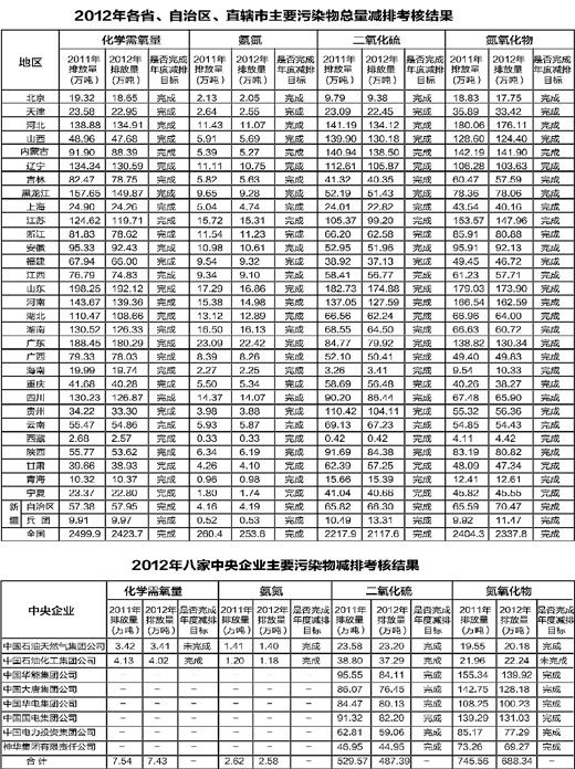 經(jīng)考核,31個省、自治區(qū)、直轄市和新疆生產(chǎn)建設(shè)兵團以及華能、大唐、華電、國電、中電投、神華六家中央企業(yè)均實現(xiàn)了2012年度各項主要污染物總量減排目標,通過年度考核;中石油未完成化學(xué)需氧量減排目標,中石化未完成氮氧化物減排目標,未通過年度考核。