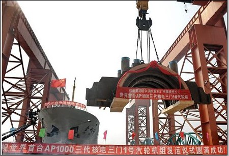 中國(guó)儲(chǔ)能網(wǎng)訊:10月8日,AP1000三代125萬(wàn)千瓦等級(jí)核電汽輪機(jī)低壓內(nèi)缸在秦皇島起運(yùn)。當(dāng)日,由哈電集團(tuán)哈爾濱汽輪機(jī)廠有限責(zé)任公司生產(chǎn)的世界首臺(tái)AP1000三代125萬(wàn)千瓦等級(jí)核電汽輪機(jī)的最后一套低壓內(nèi)缸在秦皇島重裝基地順利裝船啟運(yùn)發(fā)往三門核電站,標(biāo)志著哈電集團(tuán)哈爾濱汽輪機(jī)廠有限責(zé)任公司制造的三門1號(hào)汽輪機(jī)組主設(shè)備全部制造完成。