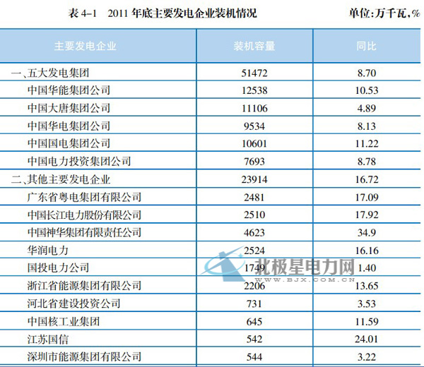 《報告》還預(yù)測,2012年全國新增發(fā)電約9000萬千瓦,年底裝機總量將突破11億千瓦。全年全社會用電量5.1-5.15萬億千瓦時,最高用電負荷6.8億千瓦。以下是2011年底主要發(fā)電企業(yè)裝機情況一覽:
