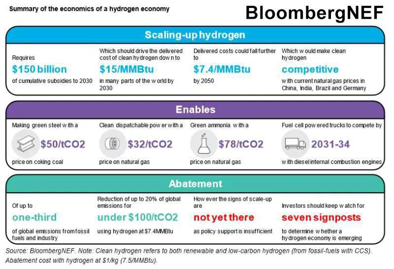 來源: 彭博新能源財經(jīng). 注:清潔氫氣既指可再生氫,也指低碳?xì)洌ń?jīng)過CCS處理的化石燃料重整制取的氫氣)。氫氣的減排成本為 1美元/千克(相當(dāng)于7.4美元/百萬英熱單位)。