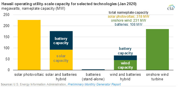 夏威夷州部署的各種可再生能源發(fā)電設(shè)施的裝機容量