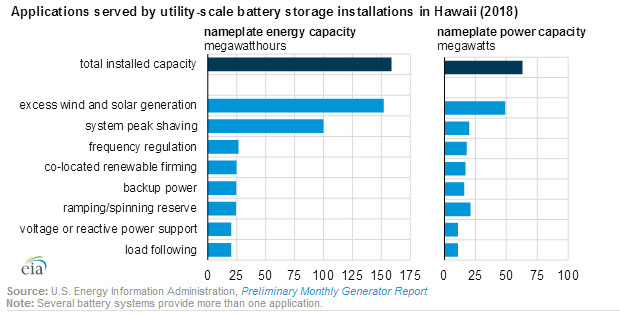 夏威夷州2018年在各種應(yīng)用場合部署的電網(wǎng)規(guī)模電池儲能系統(tǒng)