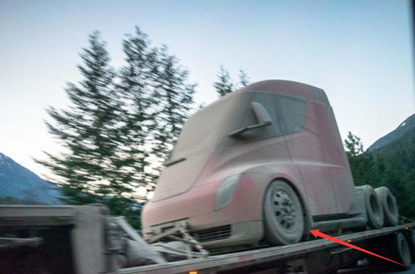 就在日前,海外的一位貨車司機拍攝到一輛特斯拉Semi被拖車拖著,該車前臉十分科幻,滿身布滿灰塵,同時前輪有明顯的外八字,顯然這是剛測試完回來。