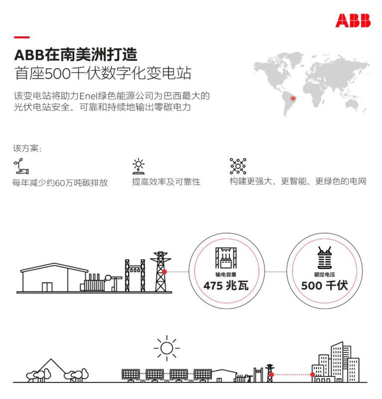 Enel綠色能源公司選擇ABB的技術(shù)建設(shè)變電站,將南美洲最大的太陽(yáng)能光伏電站S?o Gon?alo電站 (位于巴西東北部皮奧伊州)發(fā)出的零碳排太陽(yáng)能電力輸送到巴西500kV輸電網(wǎng)中。該電站為全球首個(gè)500kV交流數(shù)字化變電站。