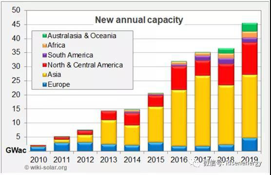 從國別來看,日本超越德國躍居第五位。去年增長最快的是越南,得益于3.4 GW的新安裝量,使其成為2019年累計(jì)裝機(jī)量全球第4名。在公共規(guī)模項(xiàng)目累計(jì)裝機(jī)容量排行榜上升了38位,至第11位。預(yù)計(jì)到2020年會(huì)有更多變化,英國可能會(huì)下降幾倍,西班牙和澳大利亞也在加速發(fā)展。沃爾夫說,在墨西哥,巴西,智利和阿根廷的領(lǐng)導(dǎo)下,南美和中美洲的地位日益突出。