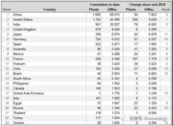 累計(jì)安裝的公用事業(yè)規(guī)模太陽能容量超過1GW的國家/地區(qū):