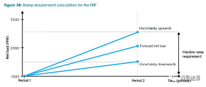 最后一個組成部分,在某些電力系統(tǒng)的備用需求當(dāng)中,顯示了電力需求和VRE曲線中的預(yù)測誤差。下圖顯示了在給定凈荷載曲線及其預(yù)測不確定性時,F(xiàn)RP的斜坡要求。