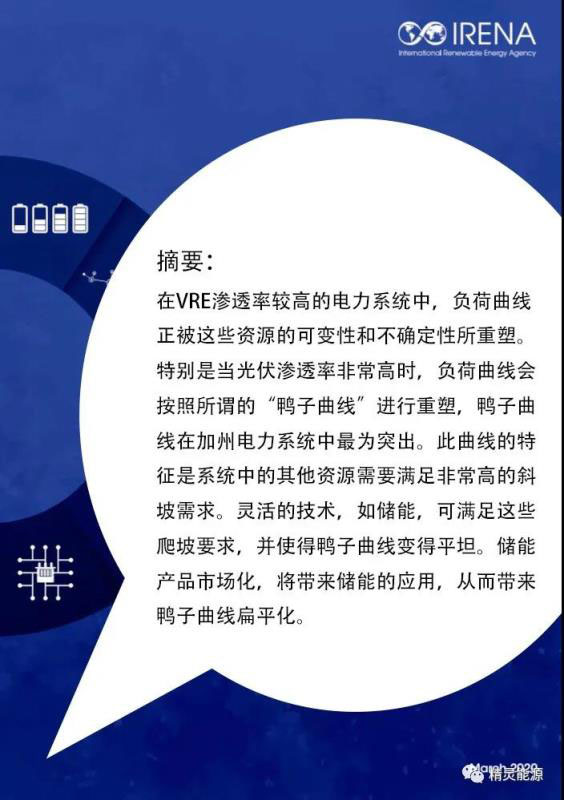 在VRE滲透率較高的電力系統(tǒng)中,負荷曲線正被這些資源的可變性和不確定性所重塑。特別是當(dāng)光伏滲透率非常高時,負荷曲線會按照所謂的“鴨子曲線”進行重塑,鴨子曲線在加州電力系統(tǒng)中最為突出。此曲線的特征是系統(tǒng)中的其他設(shè)備需要滿足非常高的爬坡需求。靈活的技術(shù),如儲能,可滿足這些爬坡的要求,并使得鴨子曲線變得平坦。儲能產(chǎn)品市場化,將帶來儲能的應(yīng)用,從而帶來鴨子曲線扁平化。