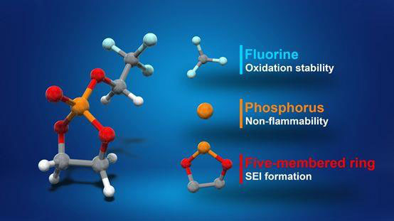 據(jù)了解,該團(tuán)隊通過融合常規(guī)電解質(zhì)溶劑EC和阻燃劑的化學(xué)結(jié)構(gòu)來設(shè)計其環(huán)狀磷酸鹽基電解質(zhì)。這提供了兩個分子的磷酸鹽特性,包括溶劑的耐高壓性和阻燃劑的不易燃性,從而最大程度地降低了鋰電池起火的風(fēng)險。