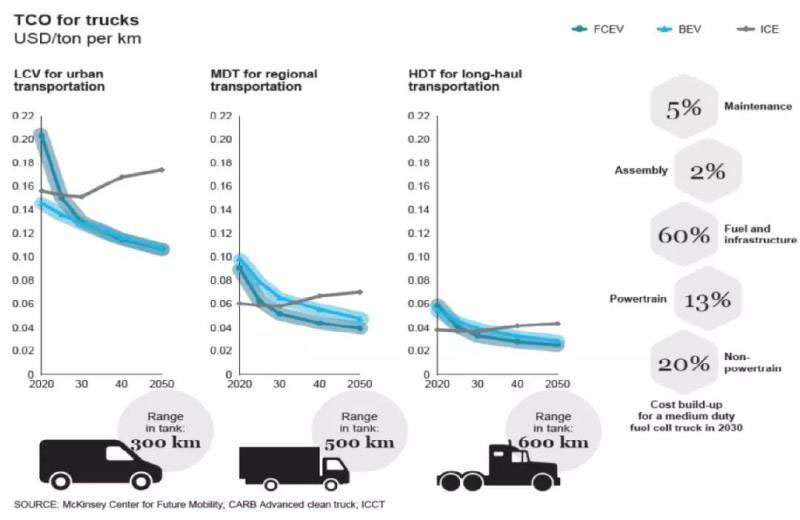 氫尤其適合16噸以上的長(zhǎng)途卡車。對(duì)于長(zhǎng)途卡車,氫被認(rèn)為是最有前途的碳中性解決方案。氫也可以作為區(qū)域分配和其他需要高耗能的應(yīng)用(例如,冷藏車/垃圾車)的合適解決方案。