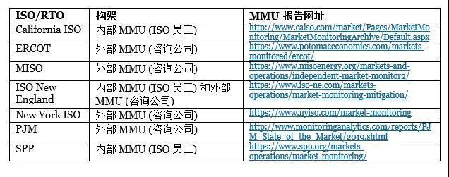 每個(gè)ISO / RTO的詳細(xì)市場(chǎng)和運(yùn)營(yíng)規(guī)則均需獲得FERC的批準(zhǔn)[12],其中包括確保MMU具有獨(dú)立地位的陳述。有幾個(gè)ISO / RTO(作為FERC批準(zhǔn)的市場(chǎng)監(jiān)測(cè)計(jì)劃的一部分)將獨(dú)立監(jiān)測(cè)功能外包給具有專業(yè)經(jīng)驗(yàn)的咨詢公司[13]。參見表1。如果獨(dú)立的MMU由ISOs / RTO的員工(而非咨詢公司員工)組成,則被稱為“內(nèi)部獨(dú)立市場(chǎng)監(jiān)測(cè)部門” [14]。但是,ISOs / RTO的管理層不能控制或者對(duì)其施加權(quán)力。例如,在稱為SPP(西南電力庫(kù))的ISO / RTO中有一個(gè)內(nèi)部MMU,經(jīng)FERC批準(zhǔn)的管理規(guī)則規(guī)定:“應(yīng)授予市場(chǎng)監(jiān)測(cè)機(jī)構(gòu)完全的獨(dú)立性,以開展為提供公正和有效市場(chǎng)監(jiān)測(cè)所需的活動(dòng)?!盵15] 此外,根據(jù)SPP規(guī)則,“市場(chǎng)監(jiān)測(cè)機(jī)構(gòu)在制定和完成報(bào)告時(shí)應(yīng)具有完全的獨(dú)立性,任何個(gè)人或?qū)嶓w都不得篩選、更改、刪除或延遲市場(chǎng)監(jiān)測(cè)機(jī)構(gòu)的發(fā)現(xiàn)、結(jié)論和建議?!盵16]