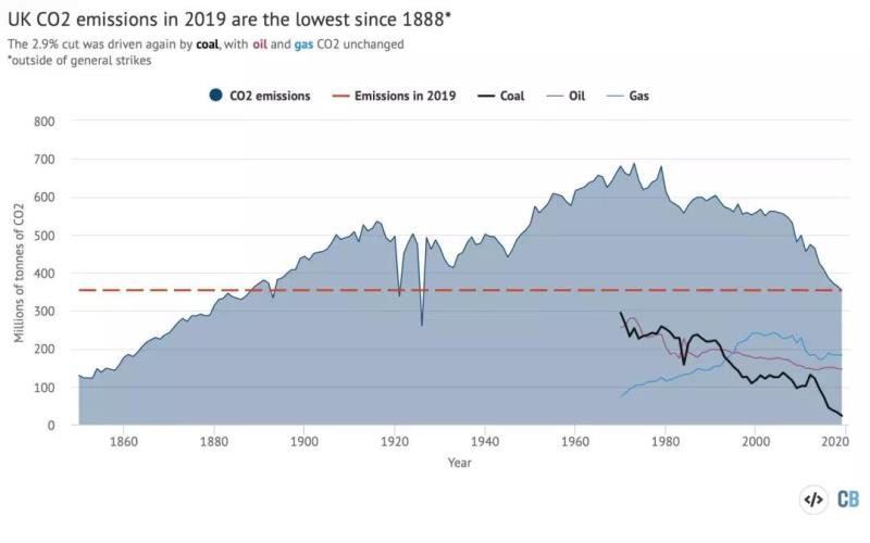 據(jù)英國CarbobBrief匯總的數(shù)據(jù),英國2019年的二氧化碳排放量約為3.54億噸,比上一年下降2.9%。這是英國的碳排放連續(xù)第七年下降,比1990年的水平低41%,意味著英國2019年的碳排放量降至1888年的水平。