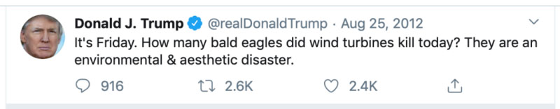 特朗普總統(tǒng)討厭風(fēng)力發(fā)電已經(jīng)不是秘密了,早在2012年他就在推特上說風(fēng)電是一場“環(huán)境和審美災(zāi)難”,并指責(zé)風(fēng)機屠殺鳥類。據(jù)報道,特朗普對風(fēng)電的敵意源于他擔(dān)心海上風(fēng)電場會損害他在蘇格蘭的一個高爾夫球場的景觀。