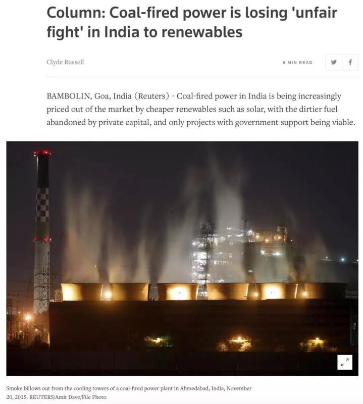 據(jù)路透社報道,印度的燃煤發(fā)電越來越被太陽能等更便宜的可再生能源擠出市場,印度的煤炭行業(yè)處于困境之中。印度煤電遇到的問題原因主要是經濟上的,而不是政策上的??稍偕茉纯稍谫忞妳f(xié)議中以每千瓦時3盧比(4.2美分)的價格提供,而現(xiàn)有的在運煤炭廠發(fā)電量以每千瓦時4盧比的價格提供,而新建煤電廠的價格在每千瓦時5至6盧比之間。