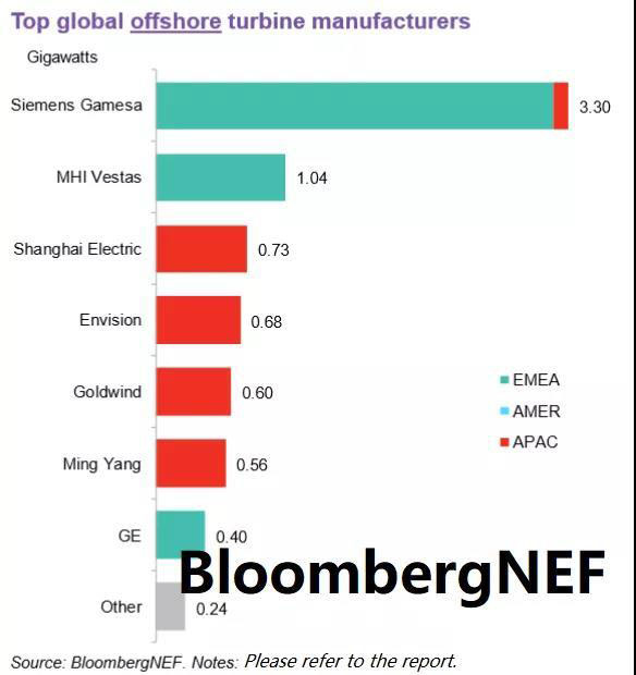 中國海上風電市場的快速崛起使得上海電氣,遠景能源,金風科技,明陽智慧能源分別位列第三到第六。