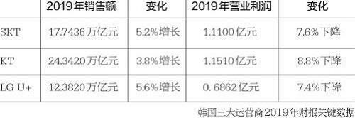 在2019年5G商用元年里,由于5G第一波高端用戶的終端補(bǔ)貼和營(yíng)銷(xiāo)費(fèi)用提升,韓國(guó)三大運(yùn)營(yíng)商在2019年的整體營(yíng)業(yè)利潤(rùn)都同比下滑。其中,KT同比下滑最多,為8.8%;LG U﹢下滑最少,為7.4%。