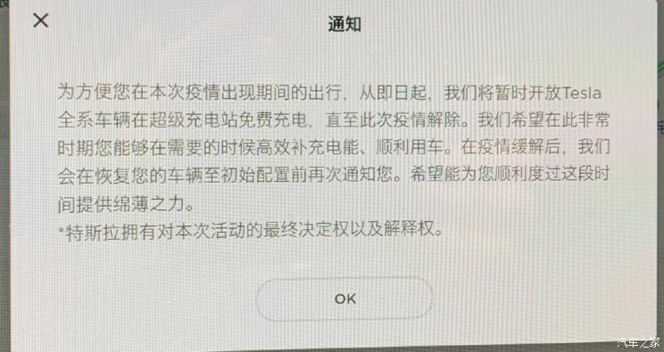 為方便您在本次疫情出現(xiàn)期間的出行,從即日起,我們將暫時開放Tesla全系車輛在超級充電站免費充電,直至此次疫情解除。我們希望在此非常時期您能夠在需要的時候高效補充電能、順利用車。