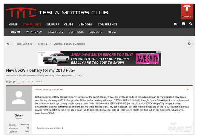 1月14日,一位昵稱為Chilam的特斯拉車主在特斯拉車主論壇(Tesla Motors Club)上表示,自己的2013款特斯拉Model S P85+車型在維修更換電池之后,得到了新款容量為85kWh的電池。