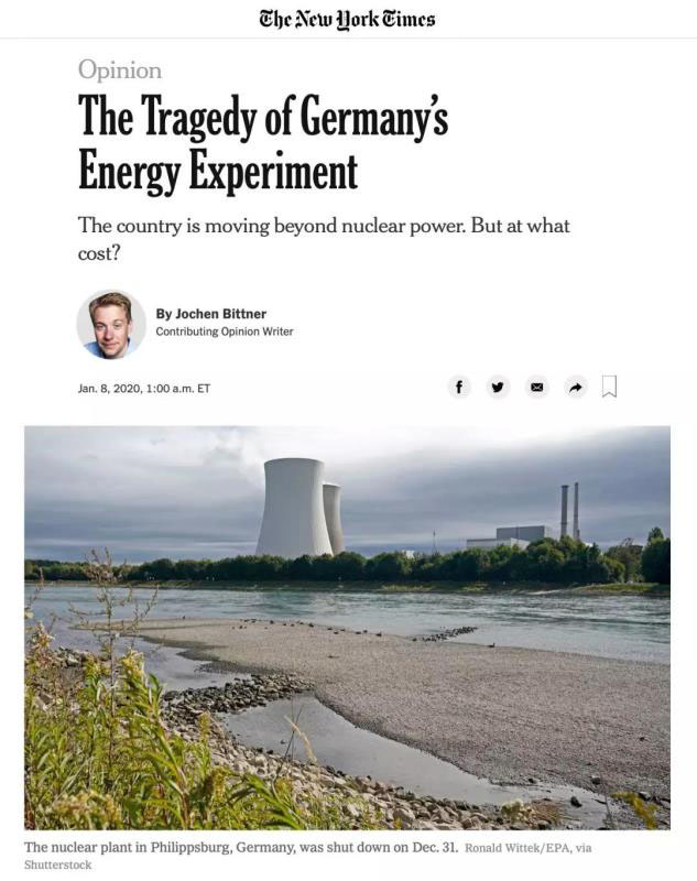 美國《紐約時報》發(fā)表署名Jochen Bittner的專欄文章評述德國的能源轉(zhuǎn)型,題目是:The Tragedy of Germany’s Energy Experiment(德國能源實驗的悲?。?,還有一個副標(biāo)題:The country is moving beyond nuclear power. But at what cost?(德國放棄核能,但是成本有多大?)