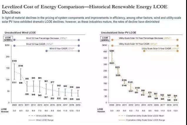 美國(guó)咨詢公司Lazard每年評(píng)估美國(guó)各類(lèi)能源發(fā)電的全生命周期平準(zhǔn)化成本(LCOE),2019年11月公布了第13個(gè)LCOE版本。