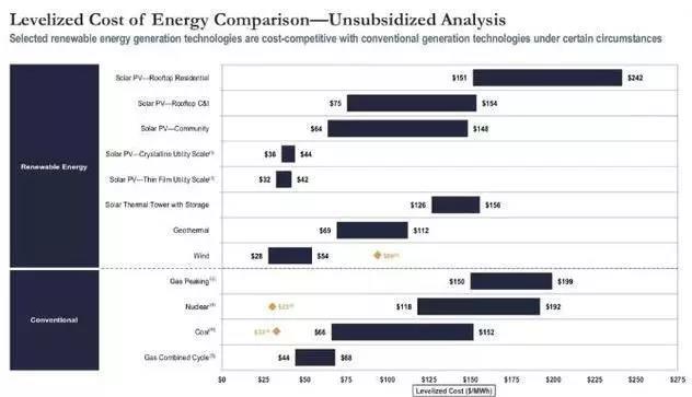 在不考慮聯(lián)邦政府稅收優(yōu)惠的情況下,美國(guó)各類(lèi)能源發(fā)電平準(zhǔn)化成本的區(qū)間如下: