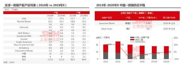 2019年國內(nèi)部分硫酸鎳企業(yè)轉(zhuǎn)產(chǎn)一級鎳,國內(nèi)產(chǎn)量同比去年增加。但因硫化礦資源稀缺,一級鎳產(chǎn)量增幅有限,預(yù)計(jì)2020年產(chǎn)量平穩(wěn)。全球來看,高鎳價(jià)刺激停產(chǎn)產(chǎn)能復(fù)產(chǎn),SavannahNorth項(xiàng)目和BlackSwan項(xiàng)目已計(jì)劃于2020年復(fù)產(chǎn),或帶來一級鎳產(chǎn)量的增加,但同時BHP計(jì)劃于2020年二季度投產(chǎn)硫酸鎳并減少一級鎳的產(chǎn)量。SMM預(yù)計(jì)2020年全球一級鎳產(chǎn)量同樣平穩(wěn)。硫化礦重啟成本高且時間周期長,未來2年內(nèi)一級鎳產(chǎn)量平穩(wěn)。