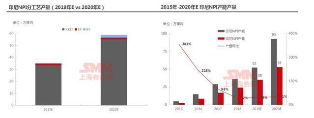 2020年印尼NPI新增產(chǎn)能主要來自青山和德龍。 2019年印尼產(chǎn)量增量主要來自:印尼德龍預(yù)計(jì)從2018年4萬噸鎳增長至8-8.5萬噸鎳,印尼青山從16萬噸鎳增長至22~23萬噸鎳,金川從無產(chǎn)出到2~3萬噸鎳;印尼高爐項(xiàng)目由于焦炭價(jià)格高企,目前全部停產(chǎn)。2020年,印尼NPI產(chǎn)量迎來爆發(fā)式增長,預(yù)計(jì)總量增至53萬鎳噸,主要增量由印尼青山和德龍供應(yīng);另外,鎳價(jià)若持續(xù)高位,停產(chǎn)的高爐項(xiàng)目有望復(fù)產(chǎn)。2020年印尼NPI產(chǎn)量將持續(xù)大增預(yù)計(jì)增加51%。
