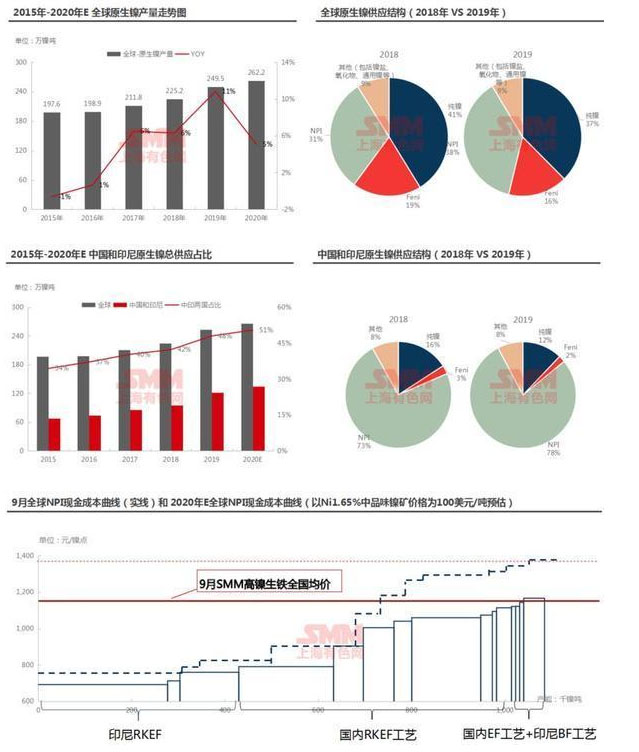 從全球原生鎳的供應(yīng)格局來看,2019年全球原生鎳產(chǎn)量為249萬鎳噸,同比增11%,增量來自中國和印尼的NPI。預(yù)計(jì)2020年全球原生鎳產(chǎn)量增長至262萬鎳噸,受中國NPI大幅減產(chǎn)影響,產(chǎn)量增速下滑。全球原生鎳供應(yīng)結(jié)構(gòu)中,二級鎳在NPI的帶動下占比繼續(xù)上升,一級鎳占比下降。中國和印尼兩國原生鎳供應(yīng)將占全球供應(yīng)的50%,主要為NPI。預(yù)計(jì)2020年鎳礦漲價(jià)將導(dǎo)致國內(nèi)NPI生產(chǎn)成本超過1300元/鎳點(diǎn)。