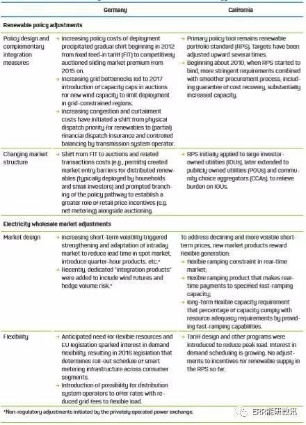 在第3節(jié),我們在此背景下考慮如何設計和改革市場和政策,以適應可再生能源在電力系統(tǒng)中所占份額的增長。如上所述,我們注意到德國,在成本并不特別令人擔憂的長期"來試試"階段之后,隨著可再生能源發(fā)電達到較高水平,市場和政策設計方面進行了實質性改革,以提高政策的成本效益,使市場更高效3。與此相反,加州的市場政策變化更為漸進,且不一定是因為可再生能源增加驅動。至少在最近,德國的政策演變可能被看作是通過法律和監(jiān)管改革發(fā)展起來的一種更為謹慎的能源轉變,而在加州,這一過程是由實驗推動的。這兩個地區(qū)都經(jīng)歷了能源成本的上漲,這引發(fā)了對推廣可再生能源的激進政策的一些反對,而且都開始擔心剛性管理的缺陷,這些缺陷有時會為可再生能源投資提供低效或不公平的激勵。表ES-1概述了電力部門的重要發(fā)展和最新趨勢以適應可再生能源。