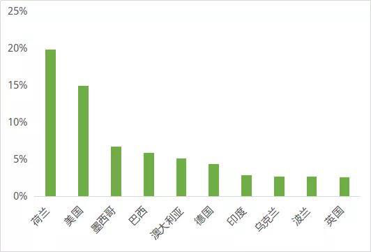 分國別看,有12個(gè)國家三季度逆變器出口金額超過500萬美元,前20個(gè)國家出口金額占比在80%。排名前列的出口國中,對荷蘭、美國、墨西哥、巴西、澳大利亞、德國出口額達(dá)到千萬美元水平。