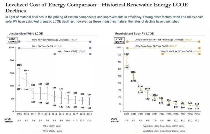從平準(zhǔn)化成本變化趨勢來看,2009年到2019年陸上風(fēng)電LCOE下降70%,10年來年平均下降11%;大型地面光伏LCOE下降89%,10年來年平均下降20%。