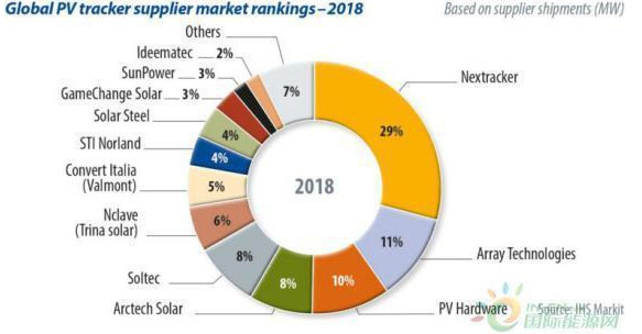 前十大跟蹤器供應(yīng)商繼續(xù)受益于光伏跟蹤器技術(shù)的廣泛采用,并且所有供應(yīng)商在2018年均實(shí)現(xiàn)了同比增長(zhǎng)的出貨量。Nextracker連續(xù)四年保持市場(chǎng)領(lǐng)先地位,占全球光伏跟蹤器出貨量市場(chǎng)份額的29%。Array Technologies仍是第二大供應(yīng)商,其次是PV Hardware,Arctech Solar和Soltec。