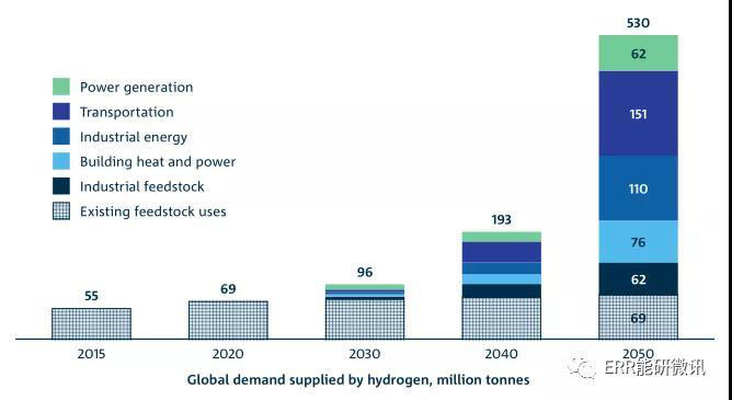 氫能理事會(huì)對(duì)2050年氫需求增長(zhǎng)的預(yù)測(cè)
