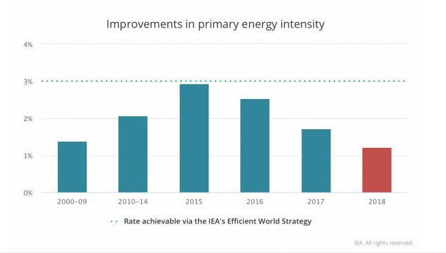 國際能源署(IEA)發(fā)布2019年版能源效率報(bào)告(Energy Efficiency 2019),指出2018年全球一次能源強(qiáng)度(衡量全球經(jīng)濟(jì)用能量的重要指標(biāo))僅改善了1.2%,明顯低于2017年1.7%的改善速度,這是該比率連續(xù)第三年下降,為2010年以來的最低水平。這也遠(yuǎn)低于IEA在2018年能源效率報(bào)告中首次提出的“高效世界戰(zhàn)略”(Efficiency World Strategy)的3%的平均改善率。