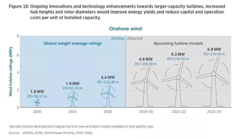 根據(jù)國際可再生能源署(IRENA)在《未來風能》報告預測,陸上風電應用的渦輪機單機容量將從2018年的平均2.6兆瓦(葉輪直徑110米)增加到2025年的5.8兆瓦(葉輪直徑170米)。