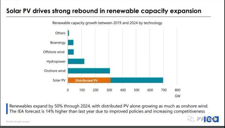 根據(jù)IEA的五年預(yù)測報告,從2019年至2024年,預(yù)計太陽能光伏行業(yè)會新增近700GW項目。根據(jù)IEA的新聞稿,在1200GW新能源項目總量中,光伏占比為60%。