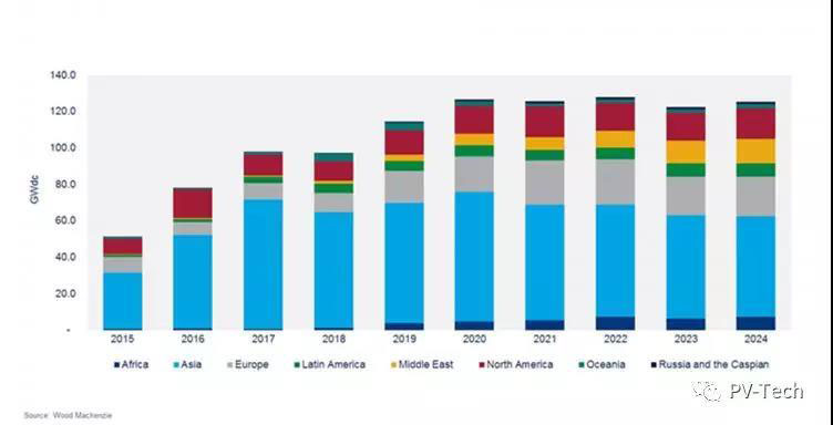 Wood Mackenzie的最新預(yù)測稱,2019年全球太陽能市場將達(dá)到114.5GW,較上年增長18%。至2024年,預(yù)計光伏年裝機(jī)量將達(dá)到120GW-125GW。
