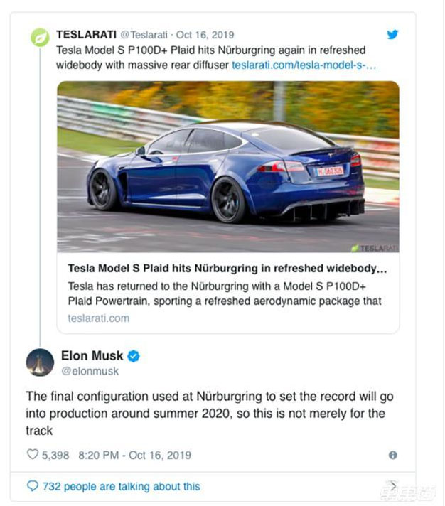 特斯拉CEO在推特上跟帖并對(duì)該報(bào)道進(jìn)行了回應(yīng),馬斯克表示,正在紐博格林上進(jìn)行測(cè)試、搭載了Plaid三電機(jī)系統(tǒng)的特斯拉Model S P100D+車(chē)型預(yù)計(jì)將在2020年夏季投入生產(chǎn)。