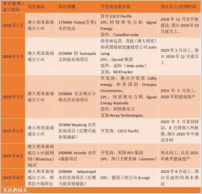 除了以上幾個項目之外,光伏們將今年年初至八月底的大型地面項目做了一個詳細(xì)的整理(項目地址基本都是在新南威爾士州),如下表所示: